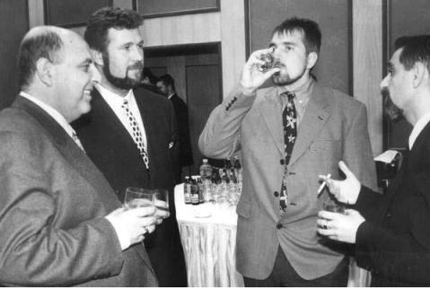 Отляво надясно: Венцислав Стефанов, съдружник в Интергруп, вицепрезидент на Славия и БфС, Румен Николов-Пашата, Бойко Борисов, шеф на фирма Ипон, Николай Златев, председател на управителния съвет и изпълнителен директор на ТСБанк Снимка "Капитал" 1995 г.