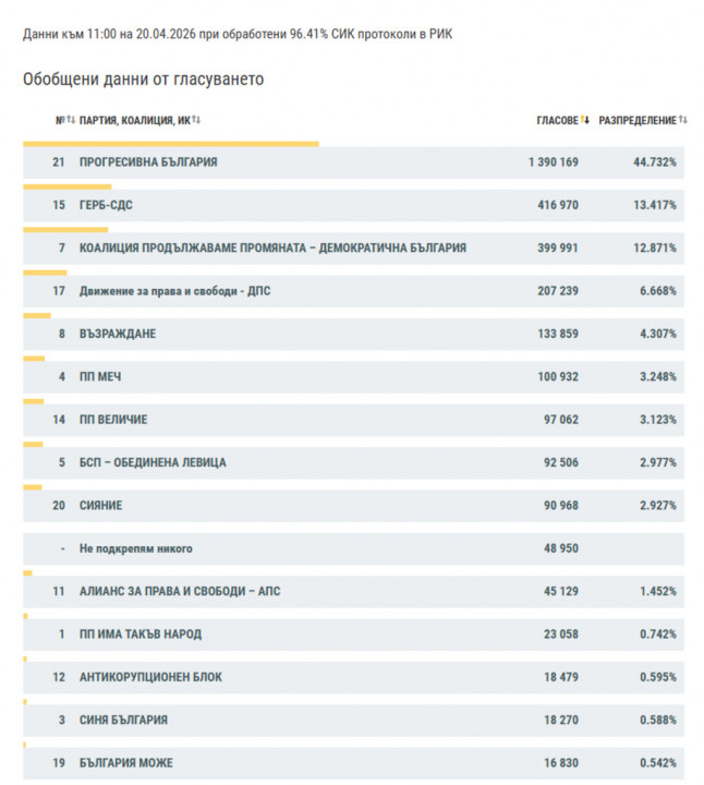 При 96,41% обработени секционни протоколи от предсрочните парламентарни избори "Прогресивна България" получава 44,73% от вота, показват данните на ЦИК.